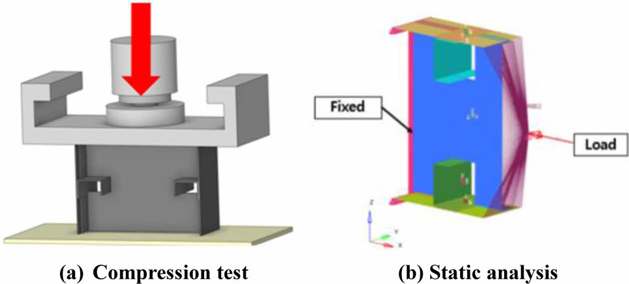 단위구조체의 압축시험을 통한 파손거동을 평가하기 위하여 만능시험기(RB-301 UNITECH-M, R&B Korea, Korea)를 사용하였으며 시험 속도는 2 mm/min으로 하였다. 하중을 가하기 위하여 Fig. 9와 같이 리브의 양쪽 엣지가 있는 면의 한쪽을 바닥에 고정하고 반대쪽에 압축하중을 가하였다.