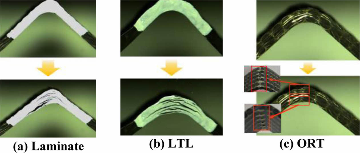 반면에 ORT의 경우 앞의 두 재료와 달리 박리는 발생하지 않았으나 곡률부 상, 하부에서 시험편 너비 방향으로 크랙이 발생하였다. 이는 직조패턴의 구조상 면 외 방향으로 삽입된 섬유 간의 넓은 간격으로 인하여 프리폼의 바깥쪽에 섬유체적율이 낮은(또는 수지의 비율이 높은) 부분들이 존재하며 하중이 작용할 때 강도가 약한 수지부분이 먼저 파손되었기 때문이다.