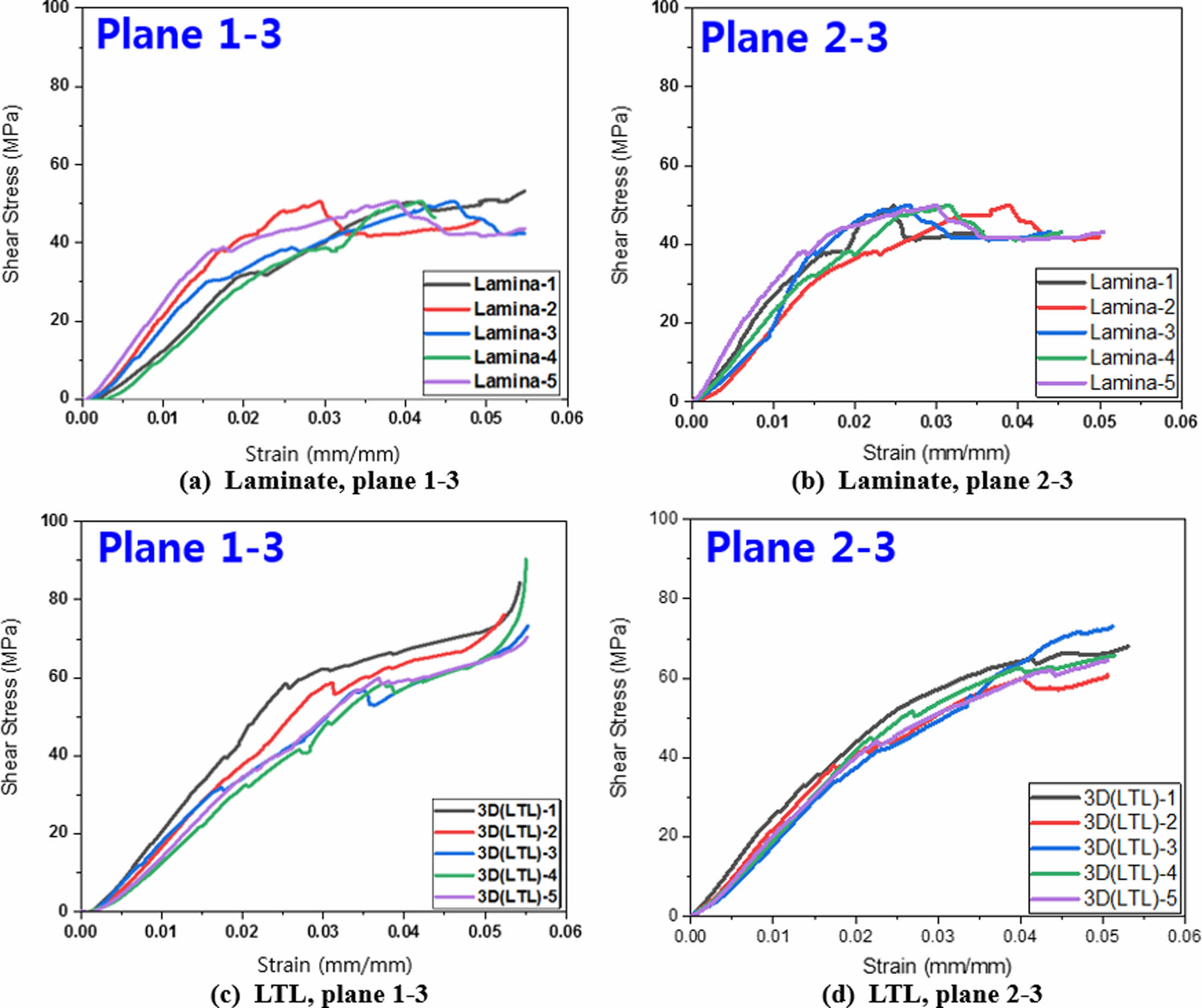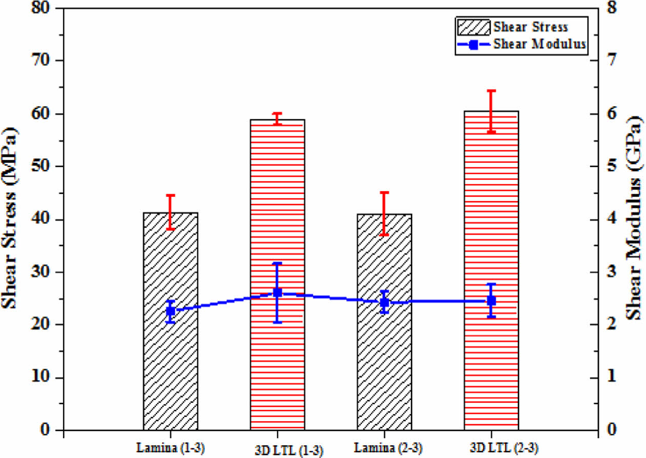 전단탄성계수(G13, G23)를 측정하기 위하여 V-Notch 전단 시험을 수행하였다. 1-3방향, 2-3방향에서 채취한 적층형과 LTL 시험편의 시험결과를 그래프로 Fig. 12와 같다. 전단시험 결과 적층형 1-3, 2-3 방향 시험편 모두 최대하중에 도달한 뒤 하중 값이 크게 떨어진 뒤 Strain만 증가하는 그래프 거동을 보였다. LTL프리폼의 경우 1-3, 2-3 방향 모두 적층형 시험편보다 상대적으로 최대하중에서 하중 값의 큰 변화 없이 계속 하중과 변형률 값이 증가하는 것을 확인할 수 있었다. 1-3 방향에서 적층형의 평균 전단탄성계수가 2.46 GPa로 LTL보다 약 9% 높았으나 강도의 경우 LTL이 적층형보다 약 42% 높았다. 2-3방향의 경우 적층형이 2.60 GPa로 LTL보다 약 6% 더 높은 전단탄성계수를 보였으나 강도는 적층형의 41.06 MPa보다 LTL이 약 47% 높은 60.55 MPa의 강도를 보였다.