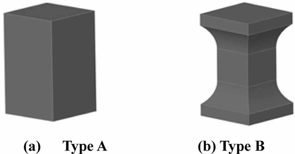프리폼의 면 외 방향 탄성계수(E33)를 측정하기 위하여 적층형과 LTL 시험편의 직접인장시험을 진행하였다. Fig. 15의 Type A, Type B 중 Type B를 선정하여 시험편을 가공하였다. Table 1은 시험편 Type에 따른 차이점을 나타낸 것으로, Type A는 인장강도를 측정할 수 없다.