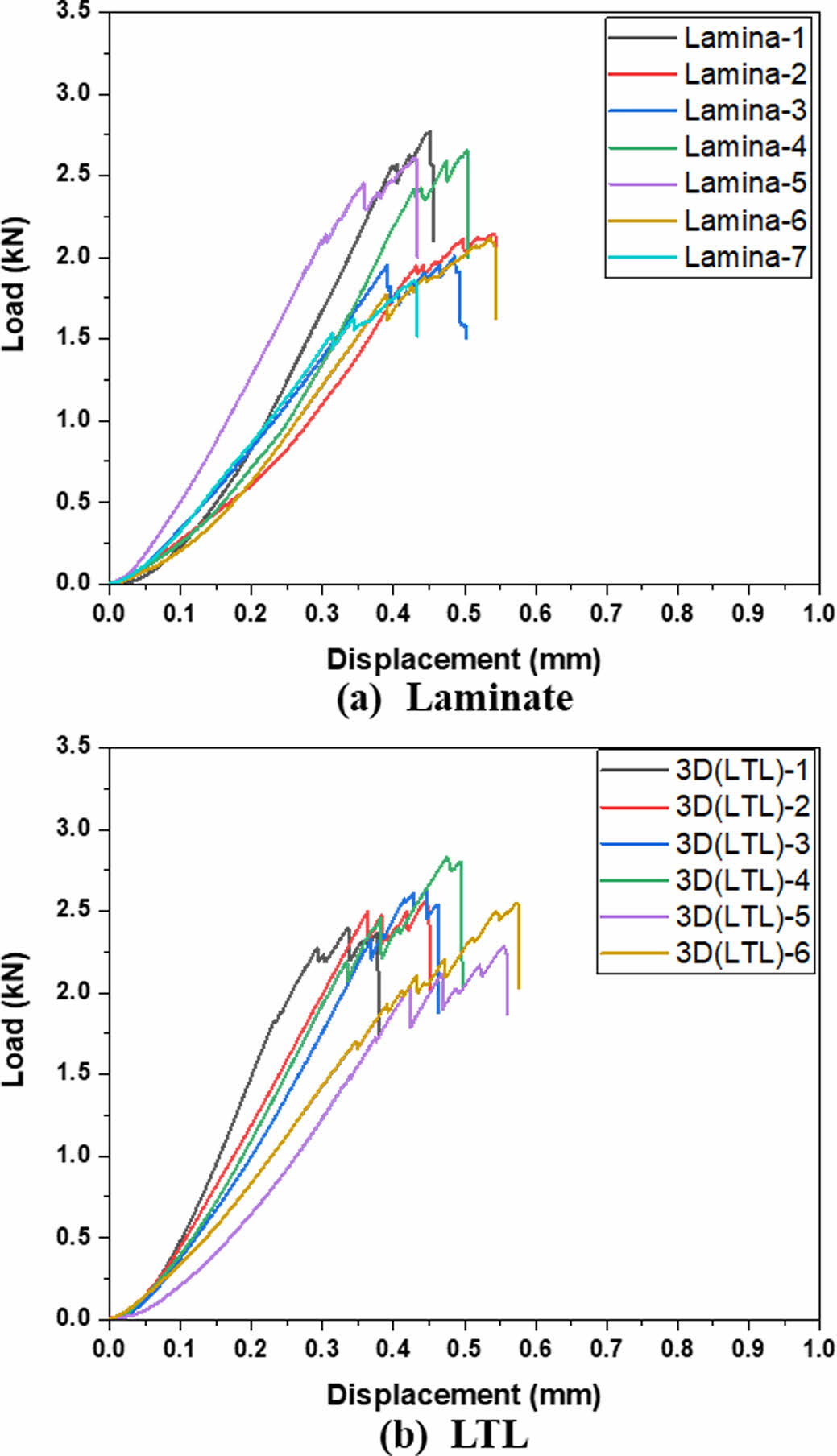 Fig. 16은 적층형과 LTL 인장 시험편의 하중-변위 곡선을 나타낸 것이다. 두 그래프 모두 유사한 인장거동을 보이는 것을 확인할 수 있다. 이러한 이유로는 인장 시험편을 제조하기 위하여 약 3.5 mm의 두께를 가진 적층형과 3D프리폼 탄소섬유 Fabric을 여러 장 적층 하여 제조하였는데, 3.5 mm의 두께를 가진 층과 층 사이는 에폭시 수지로만 결합이 되어 있어 섬유 간 결합이 낮고 그로 인해 수지의 비율이 상대적으로 높은 섬유 층과 층 사이에서 파손이 발생하였기 때문이다.