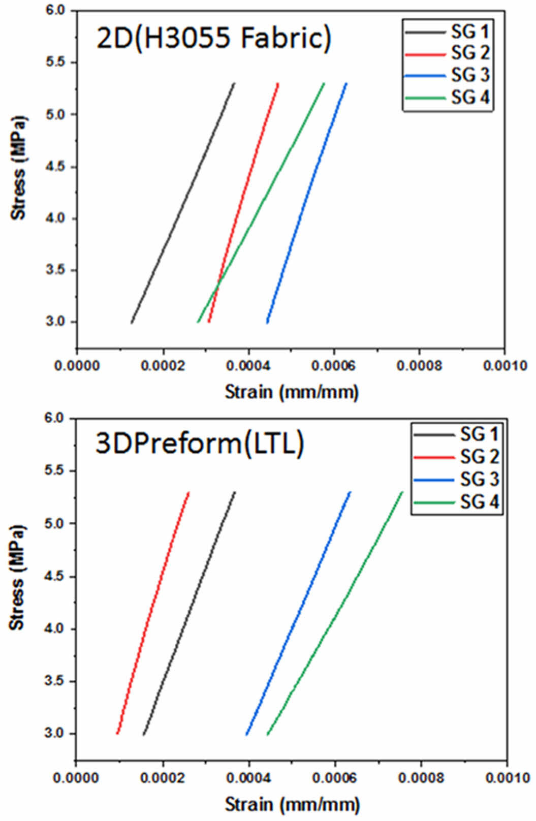 파손이 발생하기 전 하중에서 탄성계수를 측정하기 위하여 시험편의 모든 Gauge section에 단축 스트레인 게이지(SG)를 부착하여 탄성영역 내에서 실험을 진행하였다. 적층형과 3D프리폼 시험편 대한 결과값을 Table 2 나타내었다. SG 1번과 3번이 부착 방향이 같은 스트레인 게이지이며, SG 2번과 4번이 같은 방향이다.
