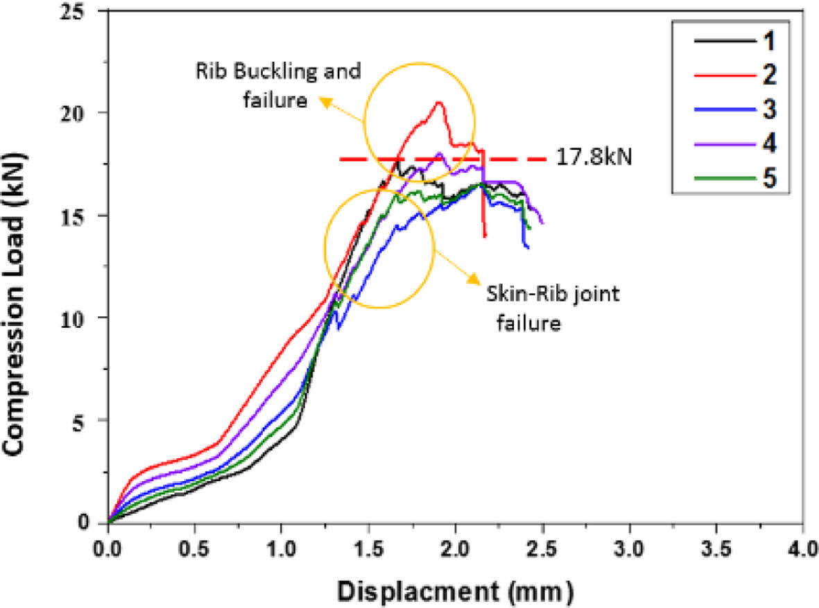 적층형 항공기 구조체의 압축강도와 파손 거동을 예측하는데 활용하기 위하여 단위구조체 제조 및 압축시험을 진행하였으며 시험 결과를 Fig. 17에 나타내었다. 압축시험 결과 그래프 거동이 모두 유사하게 나타났으며 단위구조체를 관찰하였을 때 파손거동도 유사하게 나타났다. 최대하중은 평균 17.8 kN을 보였으며 시험편 모두 마우스 홀 부근에 응력이 집중되어 파손이 발생하는 것을 확인할 수 있었다. 단위구조체에 압축하중이 가해질 때 양쪽 압축하중을 직접적으로 받는 양쪽 상단의 스킨과 리브 접합부에서 좌굴이 발생하여 접합부에서 1차 파손이 발생하였으며 접합부 파손이 발생한 뒤 Fig. 18과 같이 리브의 좌굴로 인한 마우스 홀에 횡 방향 파단이 일어나는 것을 확인할 수 있었다.