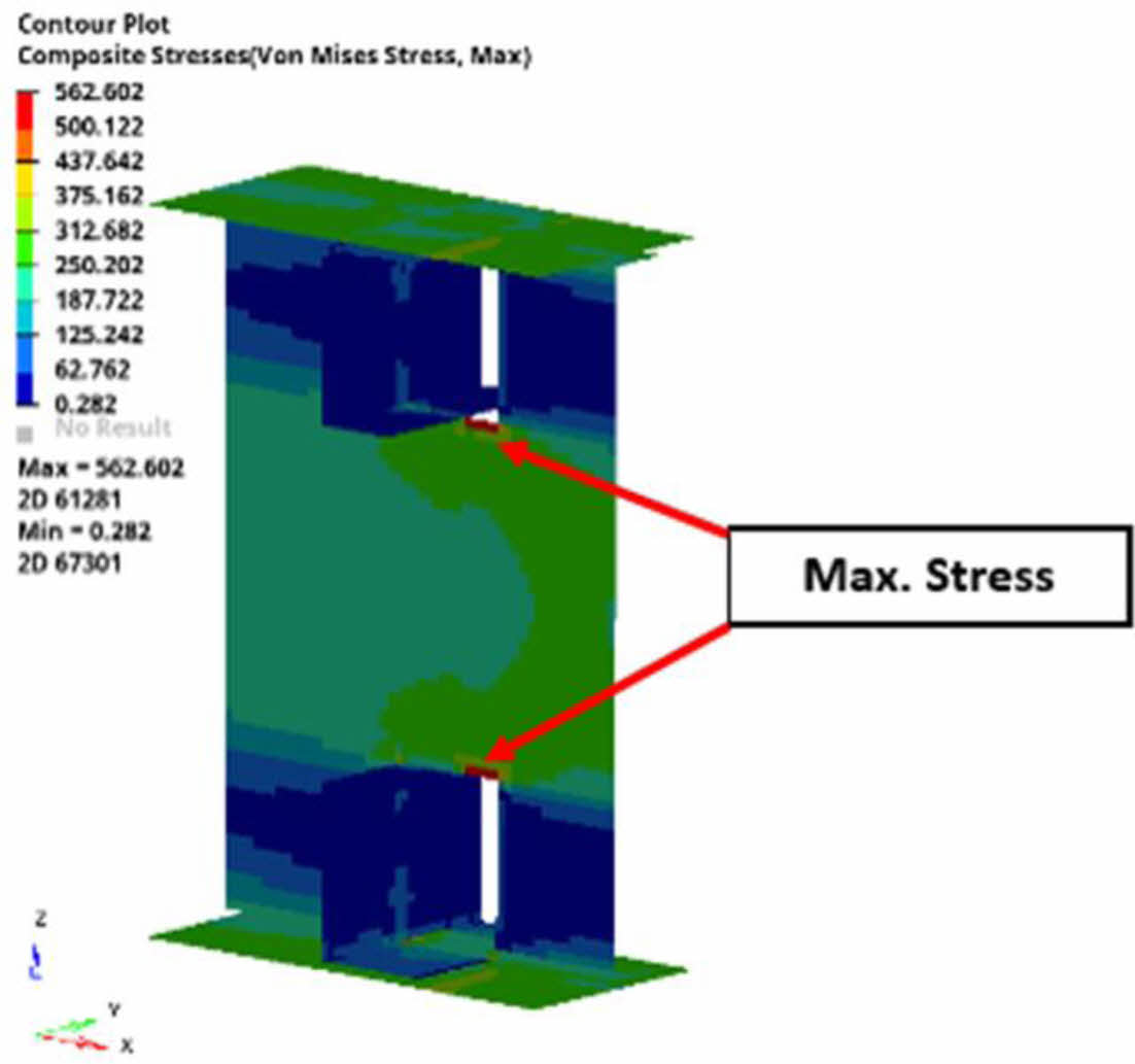 적층 복합재 단위구조체의 파손거동을 시험과 검증 비교하기 위해 압축시험에 대해 유한요소 해석을 진행하여 본 결과 Fig. 19와 같이 마우스 홀에 삽입된 스트링거의 끝단에 맞닿아 있는 리브에서 최대 응력이 발생한 것을 확인할 수 있었다. 이는 구조적인 특징으로 인하여 리브에 가해지는 하중이 스트링거에 전달되는데, 이때 두 부재의 접촉면적이 좁기 때문에 최대응력이 해당부위에서 발생할 수 있기 때문이며, 해석결과는 예측되는 거동과 동일하게 나타난 것이다.