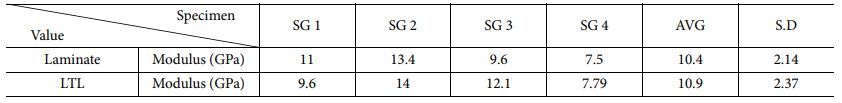 Fig. 16은 스트레인 게이지 값을 이용하여 응력-변형률 곡선의 탄성영역만을 나타낸 그래프이며, Table 2는 탄성계수를 계산한 결과이다. 적층형과 LTL 모두 오차범위 이내의 동등한 수준의 탄성계수를 가지는 것을 알 수 있다.