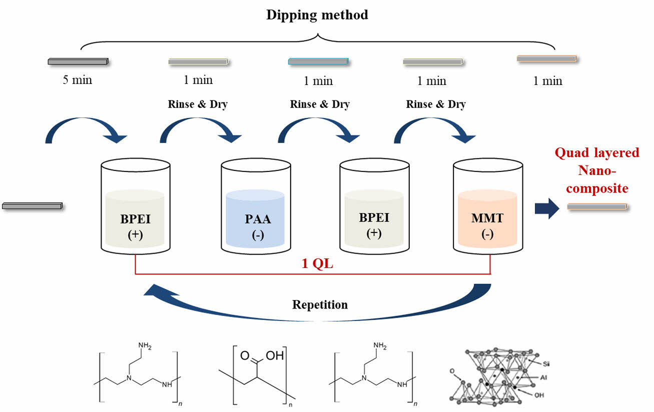 Quad-layered nanocomposites were fabricated by the same LBL process with BL coated specimens. To identifying differences by layer deposition numbers and materials, quad-layered composites were compared with bi-layered ones. Dipping time, concentration of solutions and step sequence were the same. As a results, 3QL and 5QL composites were fabricated using BPEI, PAA and MMT solutions. Illustration images of preparation was indicated in Fig. 1 and composition of specimens in this study was shown in Table 1.