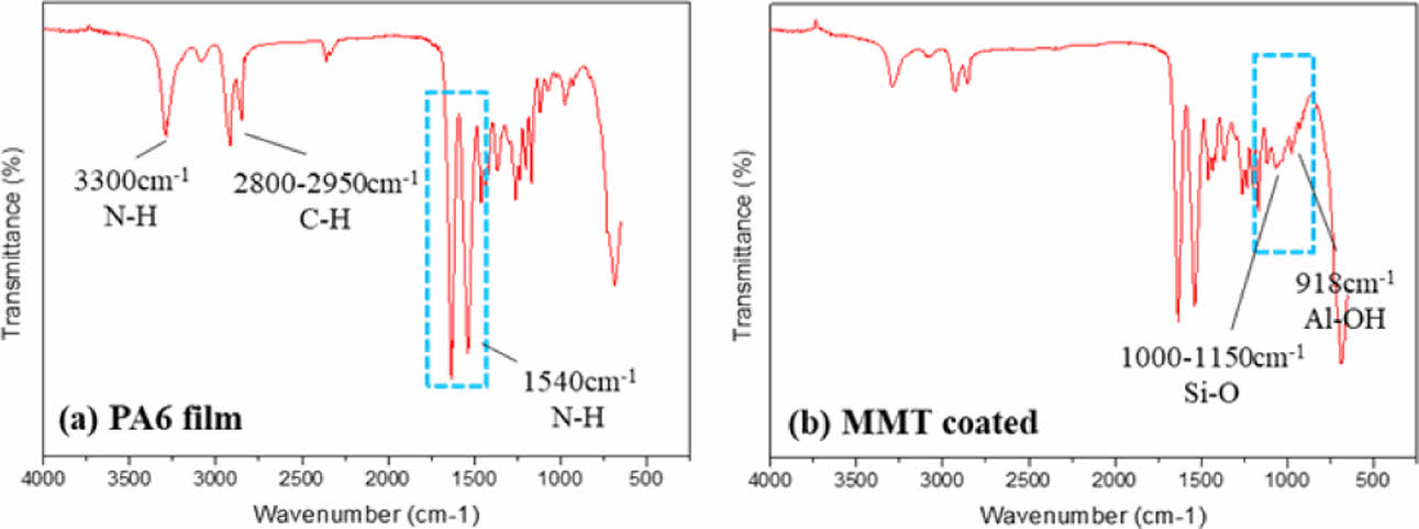 Polymer composites with thin nano-sized coating by LBL depostion method were fabricated using dip coating process. The FT-IR spectra of neat PA6 film and LBL coated composites are compared in Fig. 2(a) and (b). Peaks at 1540 cm-1 and 2800-2950 cm-1 correspond to N-H and C-H bond which are the typical chemical bonding of PA6. Peaks at 918 cm-1 and 1000-1150 cm-1 correspond to Al-OH and Si-O bond, which means that LBL coating was successfully conducted on substrate.