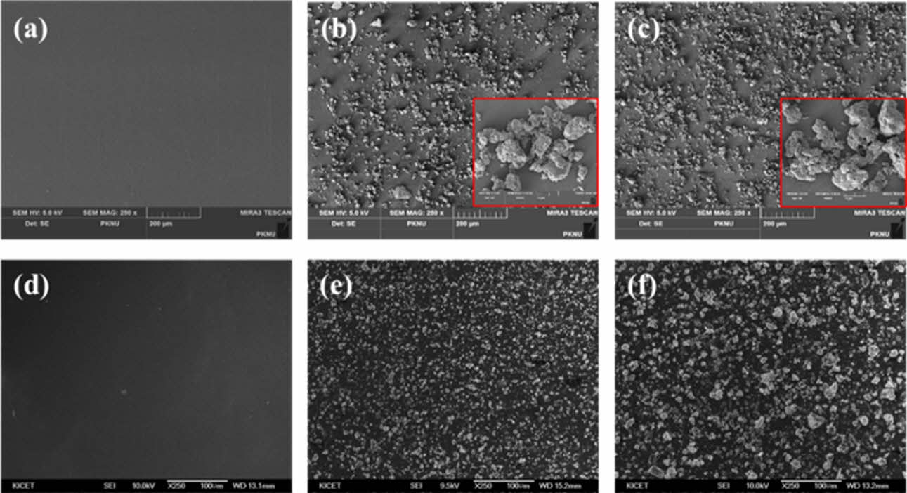 Also, morphology analysis of both nanocomposites were characterized by FE-SEM, indicating in Fig. 3. It is confirmed that LBL coating was perfectly carried out on substrate, resulted in bi-layered nanocomposites with MMT particles, while neat pa6 has clean and smooth surface (Fig. 3(a)-(c)) Aggregation of MMT particles by increasing BL numbers was observed through growing size. However, in case of QL nanocomposites, more dense structure of nanocoating was confirmed at 5QL than 3QL specimen, which was indicated in Fig. 3(d)-(f).