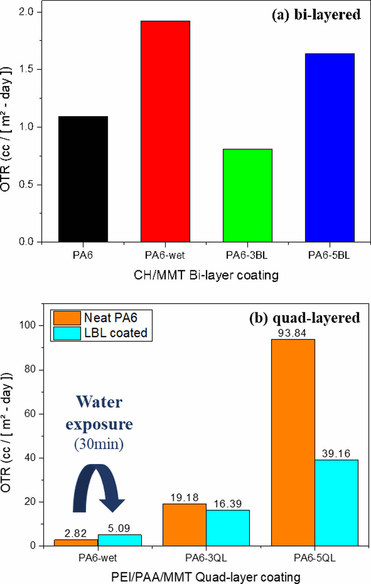 We carried out oxygen gas permeability test to investigate barrier properties of fabricated nanocomposites. In this study, it is expected that the proper condition of enhancing gas barrier property can be differentiated by deposition systems and coating materials. In Fig. 4(a), increasing permeability was observed when the substrate exposure to moisture because of hydrophilic characteristics of PA6. Moisture acts like a plasticizer when the hydrophilic materials were exposed to water. On the other hand, 3BL nanocomposite has much lower oxygen permeability although LBL process was implemented in water condition, which means that LBL coating is effective for barrier properties. Oxygen permeability slightly increased when the BL number was increased, resulted from aggregation of particles which was indicated in morphology analysis. Oxygen transmittance rate of quad-layered nanocomposites is performed as shown in Fig. 4(b). In case of QL specimens, each LBL coated samples were compared with their own neat samples, because there was huge difference between uncoated specimens owing to thick thickness of substrate. Increasing permeability was observed in neat PA6 after water exposure, as previously mentioned. Tremendous improvement in barrier property was achieved at 5QL nanocomposite, decreased 58% in comparison with neat sample. However, barrier property of 3QL was enhanced slightly because of intrinsic hydrophilic characteristic of substrate. The coating efficiency parameters by coating type and main factors are shown in Table 2. We evaluate the gas barrier property with three main factors which is moisture, neat sample and coating effect by itself. 5QL nanocomposite has more higher barrier efficiency than 5BL because QL consist of denser structure and the free volume of chitosan in BL increases by moisture. Increasing free volume of chitosan is critical to gas barrier property since free volume act as an amorphous region which can be penetrated by gas molecules.