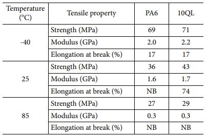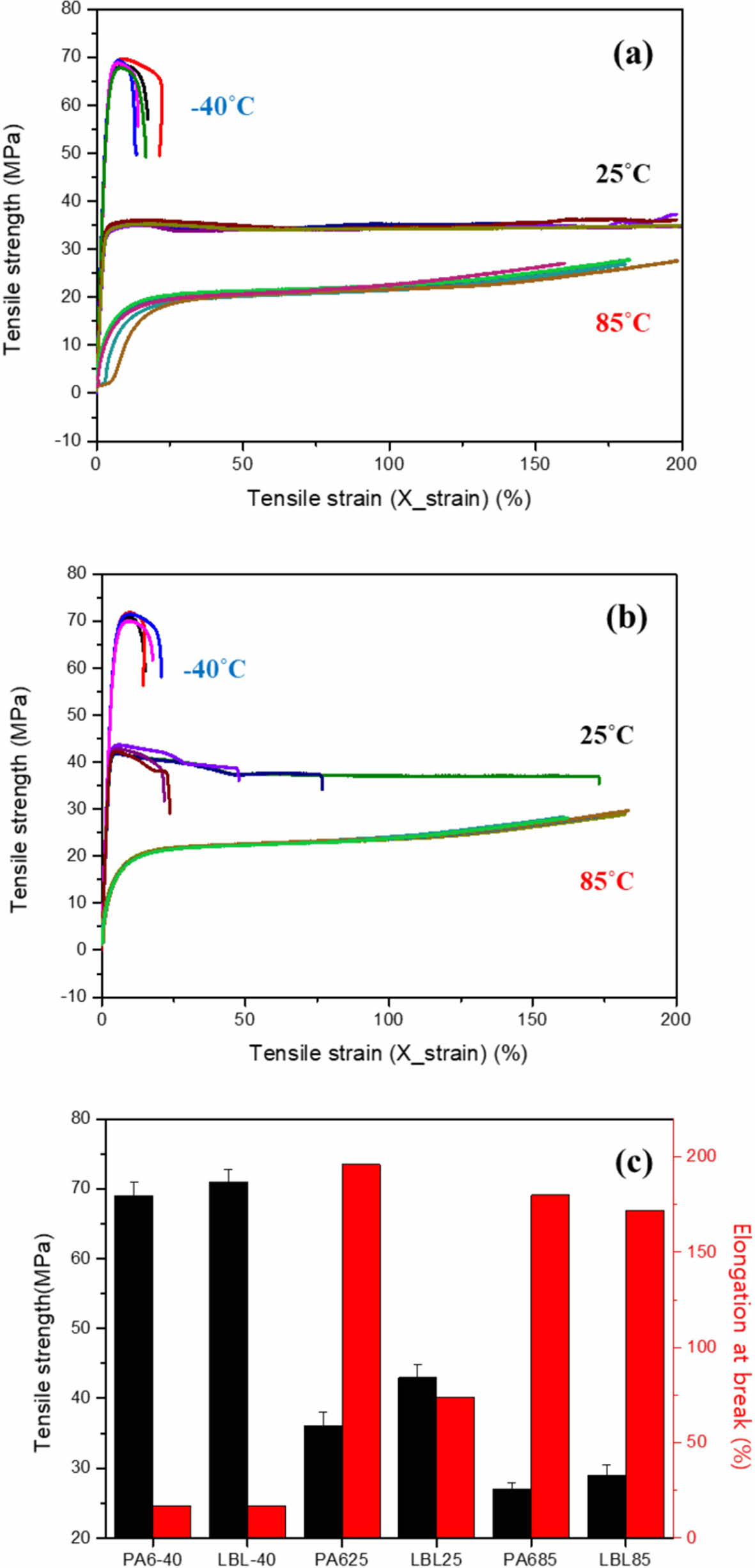 Fig. 5 Tensile properties of (a) neat PA6 film and (b) 10QL coated nanocomposites at different temperature and (c) mechanical property comparison of all specimens |