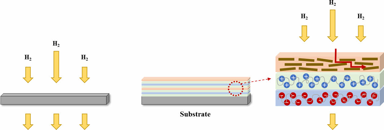 Schematic figure of gas barrier mechanism of LBL coated nanocomposites was indicated in Fig. 6. When the polymer materials exposed to hydrogen gas atmosphere, gas molecules easily penetrate through amorphous region of matrix. However, coated nanocomposites with materials which have high aspect ratio can make tortuous path longer. Higher tortuosity means lower gas permeability since it is complicated to pass through the materials. In addition, gas permeation in the polymer is influenced by amount of amorphous and crystalline structures in the polymer, backbone orientation and side chains [3]. Fillers like MMT play as a crystalline structure which are more effective as permeation barriers. Therefore, much lower hydrogen gas permeability of LBL coated nanocomposites was achieved.