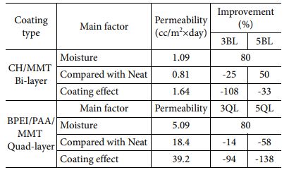 Table 2 Oxygen permeability of nanocomposites by different LBL system compared with various parameters for barrier property |