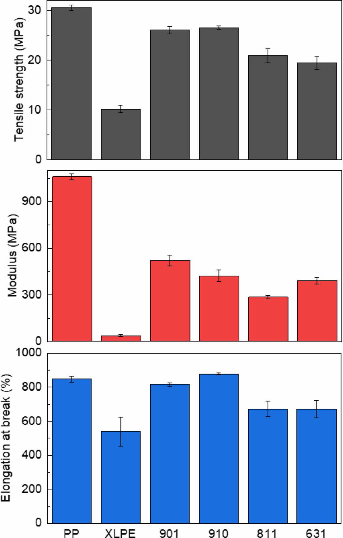 Fig. 1 Tensile strength, modulus, and elongation at break values of the PP, XLPE, 901, 910, 811, and 631 blend samples, respectively |