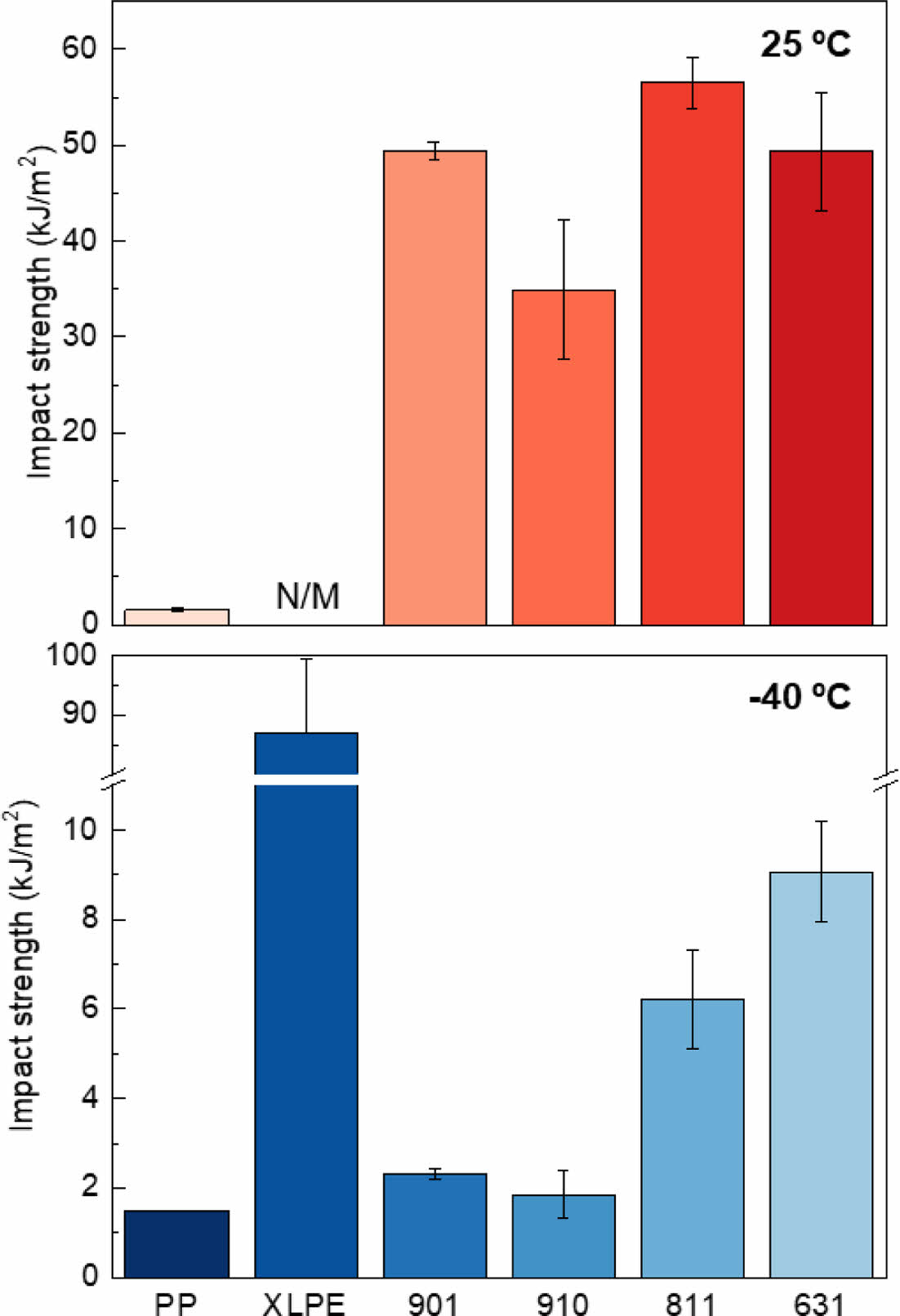 Fig. 2 IZOD impact strength values at 25 and -40 ºC of the PP, XLPE, 901, 910, 811, and 631 blend samples, respectively |