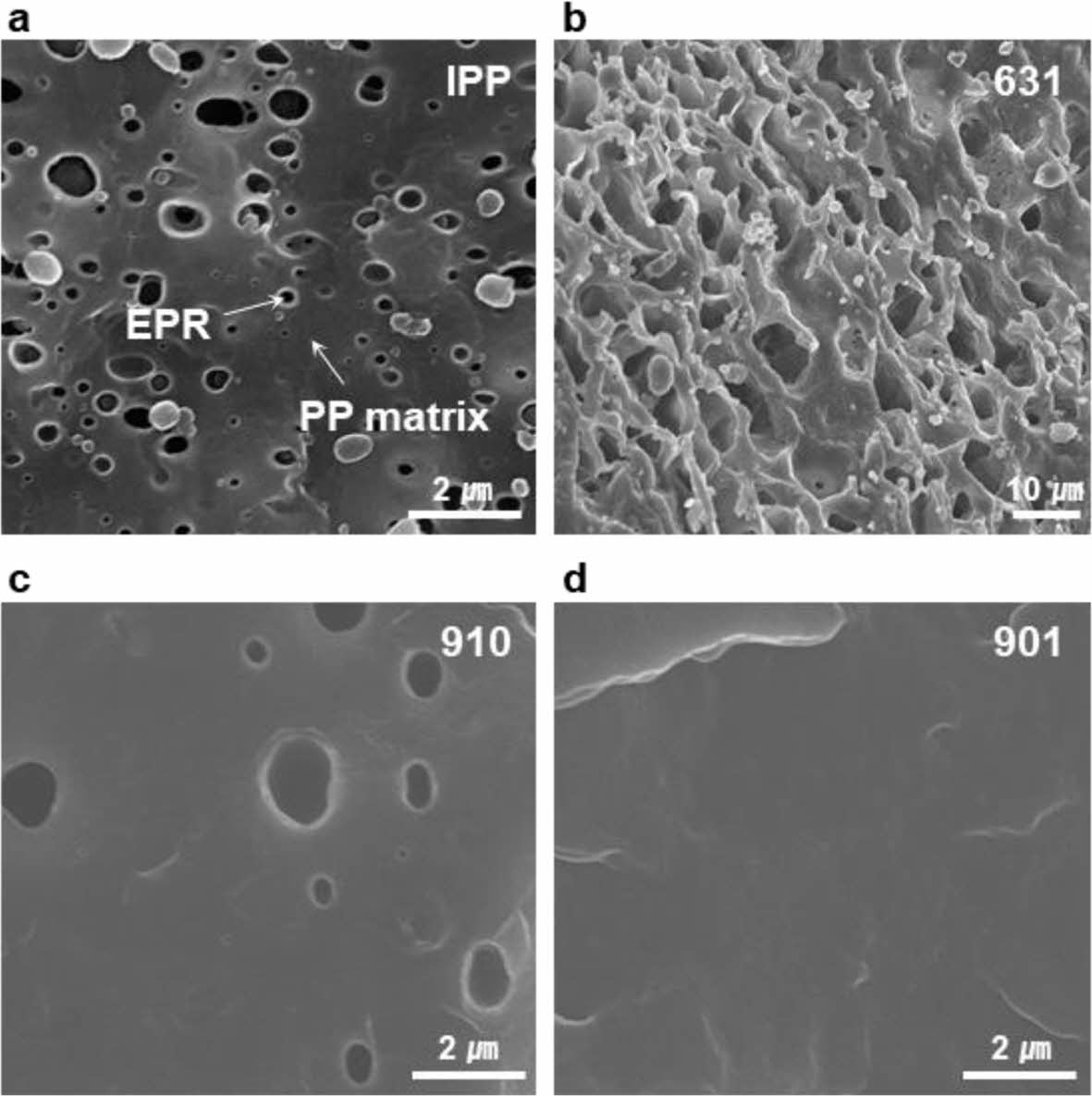 Fig. 3 SEM images of (a) impact-modified PP (IPP), (b) 631, (c) 910, and (d) 901 blend samples |