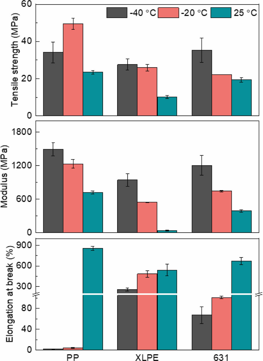 Fig. 4 Tensile strength, modulus, and elongation at break values at 25, -20 and -40 ºC of PP, XLPE, and 631 blend sample |