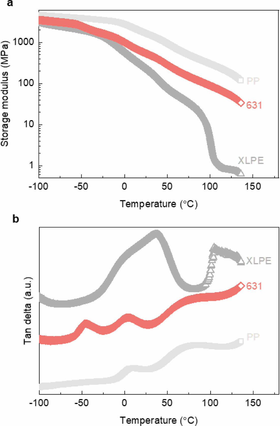 Fig. 5 (a) Storage modulus and (b) tan delta of the PP, XLPE, and 631 blend sample as a function of temperature |