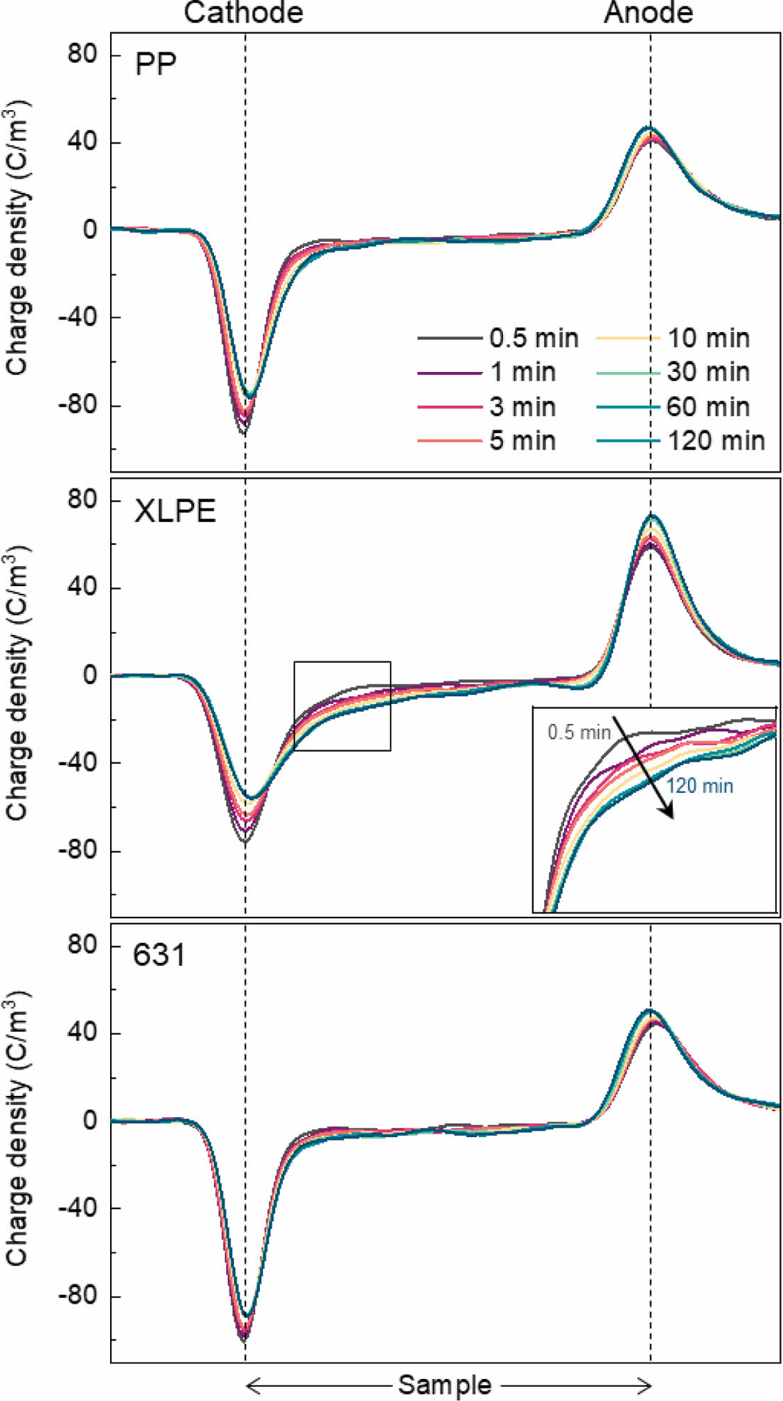 Fig. 6 Space charge distribution of PP, XLPE, and 631 blend sample |