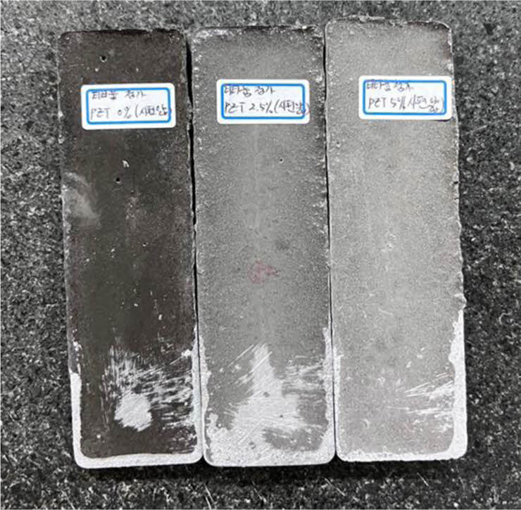 에폭시는 국도화학의 YD-128, 경화제로는 KH-816 제품을 사용하였다. 전도체 및 저항체로 이용하기 위해 평균 직경 44 mm의 티타늄 파우더를 사용하였으며, PZT 파우더는 평균 직경 1 mm, 밀도 7.7 g/cm3, 압전상수 d31 = -185 × 10-12 m/V, d33 = 392 × 10-12 m/V를 가지는 아이에스테크놀로지 사 PC-50 제품을 사용하였다. 폴리머 콘크리트 시편은 Silica sand (4호, 6호)를 골재로 이용하여 에폭시, 티타늄 파우더와 함께 제작하였으며 상세한 배합비는 Table 1과 같다. 해당 배합비를 유지하면서 PZT 파우더를 2.5 wt%, 5 wt% 첨가하여 Fig. 1과 같이 PZT 파우더를 첨가하지 않은 0 wt% 시편, 2.5 wt% 첨가 시편, 5 wt% 첨가 시편 3종류를 제작하여 실험에 이용하였다.