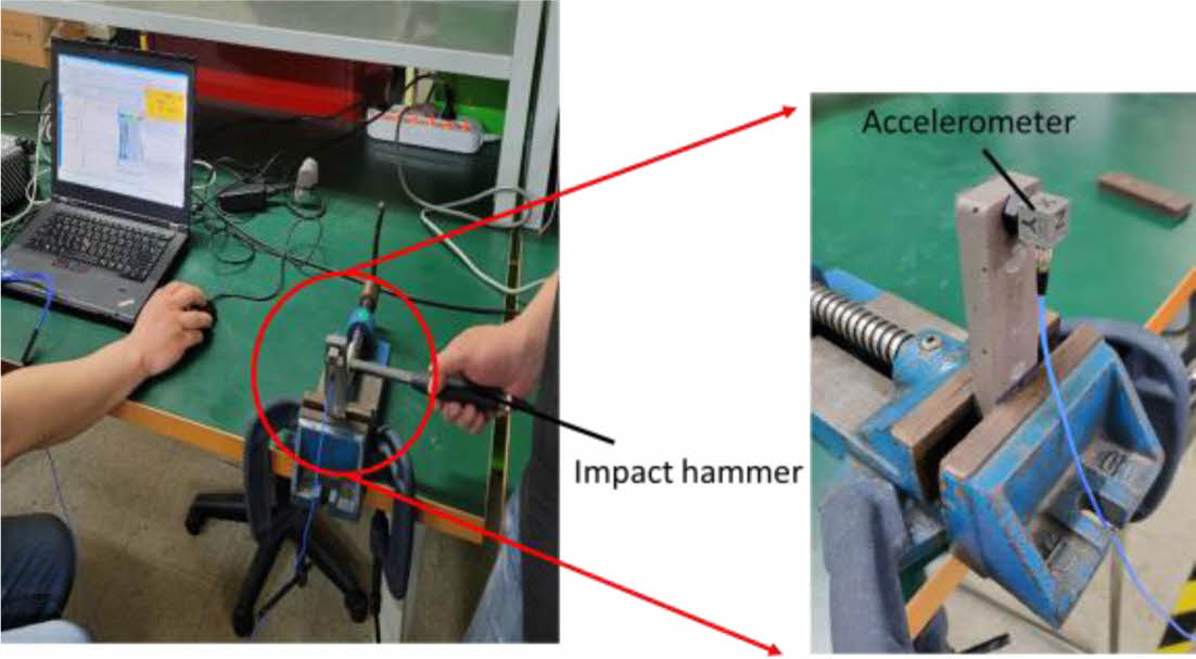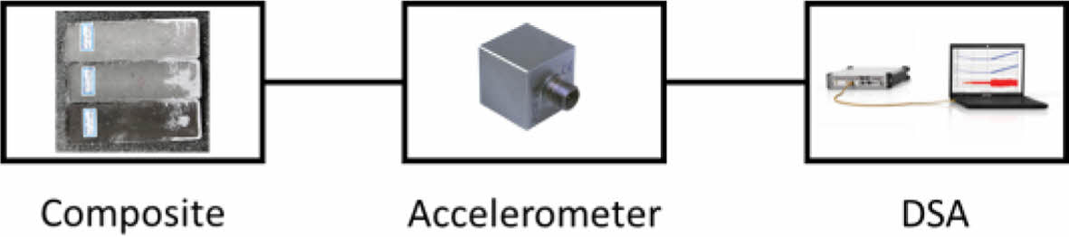 복합재료에 부착된 가속도 센서를 이용해 충격에 대한 응답을 측정한다. 측정 신호는 DSA(Digital Signal Analyzer)를 통해 주파수 응답을 분석할 수 있다. Fig. 3에 가진 실험에 대해 나타내었다. 복합재의 한쪽 끝은 고정시키고 자유단 쪽에 가속도 센서를 부착한다.