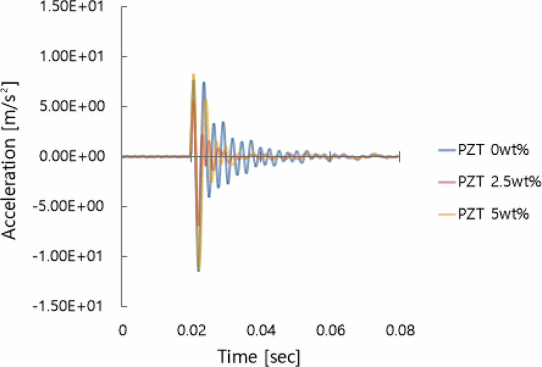 각 시편에 임팩트 해머를 이용하여 충격을 가한 직후의 시간에 대한 시편 끝단의 가속도 측정 결과는 Fig. 4와 같다. 각 케이스 별 3회 반복하여 실험을 진행하였으며 대표 결과값을 그래프로 나타내었다. 그림에서 볼 수 있듯이 PZT를 첨가하지 않은 시편이 PZT를 첨가한 시편에 비해 진동이 비교적 길게 유지되는 것으로 나타났다. 즉, 진동 발생 시 첨가된 PZT의 압전 효과에 의한 에너지 손실로 인해 시편의 진동 변화 폭이 크게 감소하는 것으로 보인다.