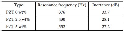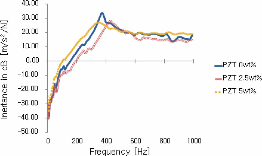 또한, 이러한 진동 특성 변화 경향을 한 번 더 확인하기 위해 주파수에 따른 전달함수 Inertance 값을 Fig. 5에 나타내었다. 3가지 시편 모두 공진주파수는 400 Hz 부근에서 나타났으며, 그 때의 Inertance 값을 dB로 Table 2에 나타내었다. PZT 파우더를 첨가하지 않은 시편에서는 그 값이 33.7 dB로 나타났으며, PZT 2.5 wt% 첨가 시편은 28.1 dB, PZT 5 wt% 첨가 시편은 27.2 dB로 PZT 파우더 함량이 높을수록 Inertance 값이 각각 16.6%, 19.3% 만큼 감소하는 경향을 보였다. 이는 시간에 따른 가속도 측정결과와 마찬가지로 충격이 전달될 때 PZT 파우더가 변형되어 전기에너지를 발생시키고, 이러한 전기에너지가 열로 바뀌어 전달되는 에너지가 감소하는 것으로 보인다.