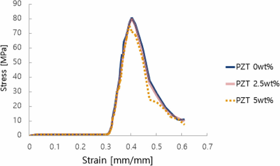 건축물에 사용되는 구조재료에서 가장 기본적이고 중요한 기계적 물성인 압축강도를 살펴보았다. 일반적으로 구조재료에 particle이 첨가되면 기계적 강도가 저하되는 경향을 보이기 때문에[14] PZT 첨가에 따른 압축강도의 변화를 살펴보고자 하였다. 압축 물성 시험은 만능시험기(Universal Testing Machine)를 사용하여 시험 속도 3 mm/min로 압축 강도 시험을 진행하였다. 사용한 시편의 두께는 12 mm, 너비 15 mm이고, Strain에 따른 Stress를 측정하여 나타내었다.