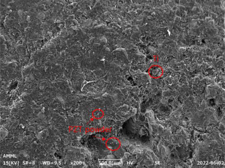 파우더를 첨가한 복합재료를 사용하여 실험을 진행하였기 때문에 기존에 설계한 성능을 그대로 구현하기 위해서는 시편 제작 시 파우더가 기지재에 잘 분산되는 것이 전제 조건이다. 이를 확인하기 위해 주사전자현미경(Scanning electron microscope, SEM)을 이용한 시편 단면 분석을 진행하였다. PZT 함량이 가장 많은 5 wt% 시편을 사용하여 측정하였으며 그 결과는 Fig. 7과 같다. Fig. 7에서 평균 1 mm 직경을 가지는 PZT 파우더가 분산되어 있는 것을 확인할 수 있고, 티타늄 파우더 또한 고르게 분산되어 있는 것을 확인할 수 있다.