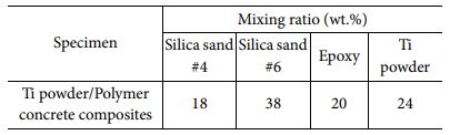 개방형 실리콘 몰드를 사용하여 시편을 제작하였으며,각 케이스 별로 제작한 시편의 크기는 30 mm × 12 mm × 100 mm이다. Table 1에서 나타낸 배합비대로 혼합물을 만들고 Shear mixer를 이용해 5분간 교반시킨다. 교반 후 혼합물은 에폭시가 충분히 경화될 수 있도록 상온에서 48시간 유지하였다. 시편을 제작할 때 금속 입자가 무거우면 에폭시가 경화되기 전에 폴리머 콘크리트 한 면으로 가라앉는 현상이 발생할 수 있다. 따라서 이를 균일하게 분산시키기 위해 스토크스 법칙을 이용한 혼합물 내에서의 종단 속도를 고려하여 다른 금속에 비해 낮은 밀도(4.5 g/cm3)를 가지는 티타늄 파우더를 사용하여 제작 시 침전을 최소화하고자 하였다.