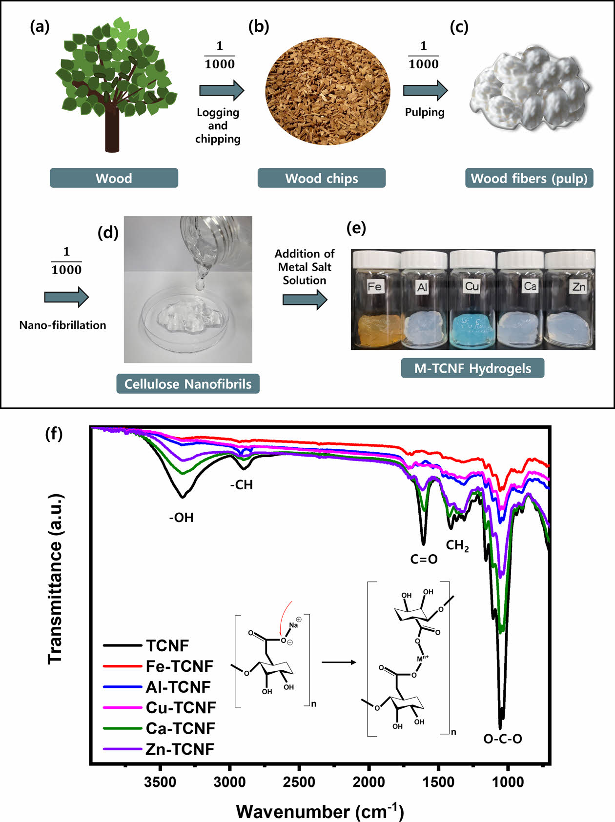 본 연구에서는 TEMPO 촉매 산화 반응을 한 셀룰로오스 나노피브릴인 TCNF(tempo cellulose nanofibrils, 에이앤폴리㈜)와 Sigma Aldrich에서 구매한 5가지 금속염 (Fe(NO3)3, Al(NO3)3, Cu(NO3)2, Ca(NO3)2, Zn(NO3)2)을 사용하였다. 증류수에 각각의 금속염(metal salt)이 50 mM 농도가 되도록 용해시킨 후 2 wt% TCNF에 one-pot 방식으로 첨가하였다. 용해된 금속염 용액과 TCNF가 들어있는 샘플을 4oC 냉장고에 하루동안 보관하였다. 이후 반응하지 않고 남아있는 양이온들을 제거하기 위해서 금속-카르복실레이트 배위 결합을 형성한 하이드로겔들을 증류수로 세척하였다.