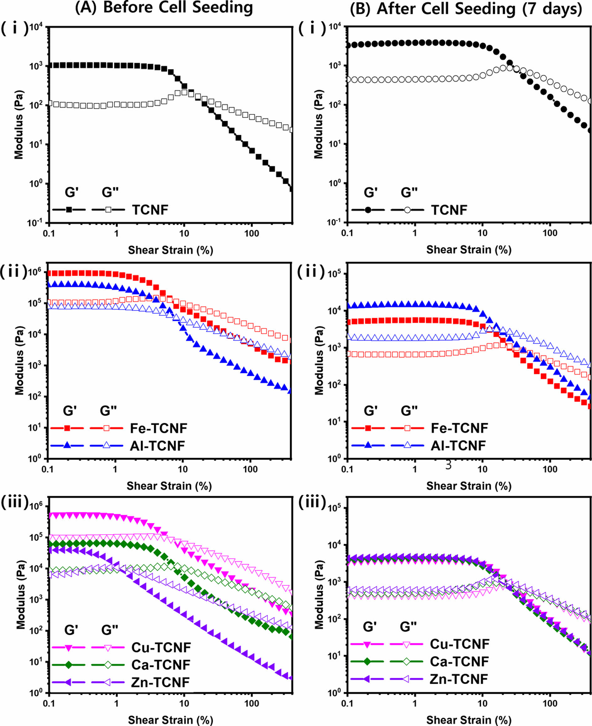 Fig. 2 Strain amplitude sweep test of TCNF and M-TCNF (A) before and (B) after cell proliferation (7 days): (i) neat TCNF, (ii) trivalent MTCNF hydrogels, and (iii) divalent M-TCNF hydrogels |