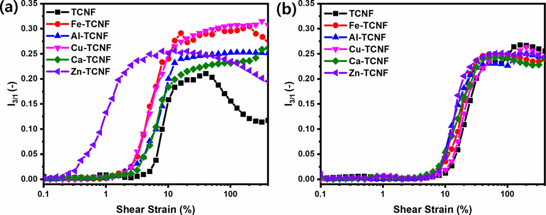 순수한 TCNF와 금속-카르복실레이트 배위 결합된 하이드로겔(M-TNCF)들의 기계적 물성 및 변형 거동을 분석하기 위해 레오미터(rheometer) (MCR-302, Anton Paar, Austria)를 이용하여 유변학적 거동을 평가하였다. 유변물성 측정은 25 mm의 평판 플레이트(parallel plate)를 사용하였다. 다양한 유변물성 측정 방법 중 큰 진폭 진동 전단(large amplitude oscillatory shear, LAOS) 실험을 진행하였으며, LAOS 측정 시 각주파수(angular frequency)는 1 rad/s로 고정하여 변형율(strain)을 0.1-400%까지 증가시키면서 측정하였다. 모든 측정은 온도 제어 챔버(temperature-controlled chamber)를 이용하여 25oC로 유지하였고, 측정 중 TCNF와 M-TCNF 하이드로겔들의 수분 증발을 방지하기 위해 미네랄 오일로 외부 공기와 접촉을 차단하였다.