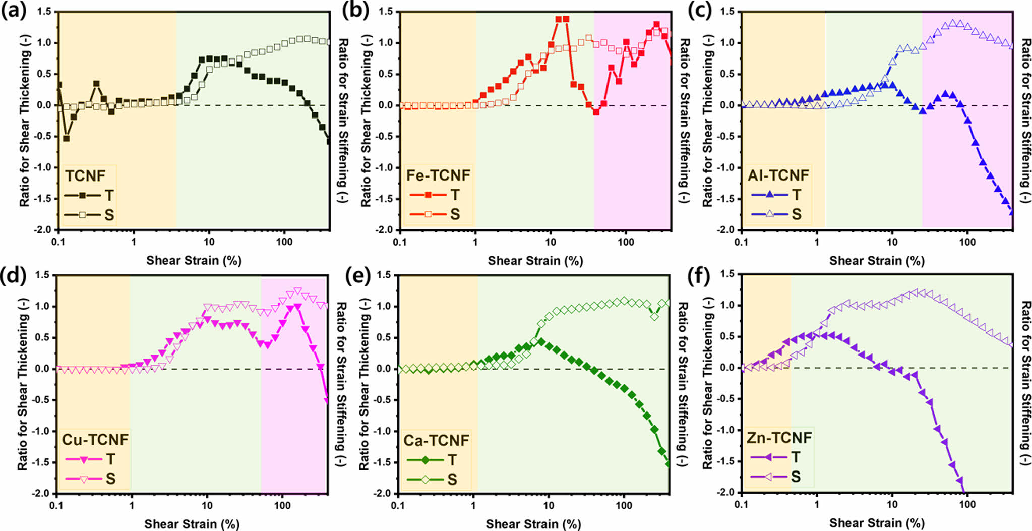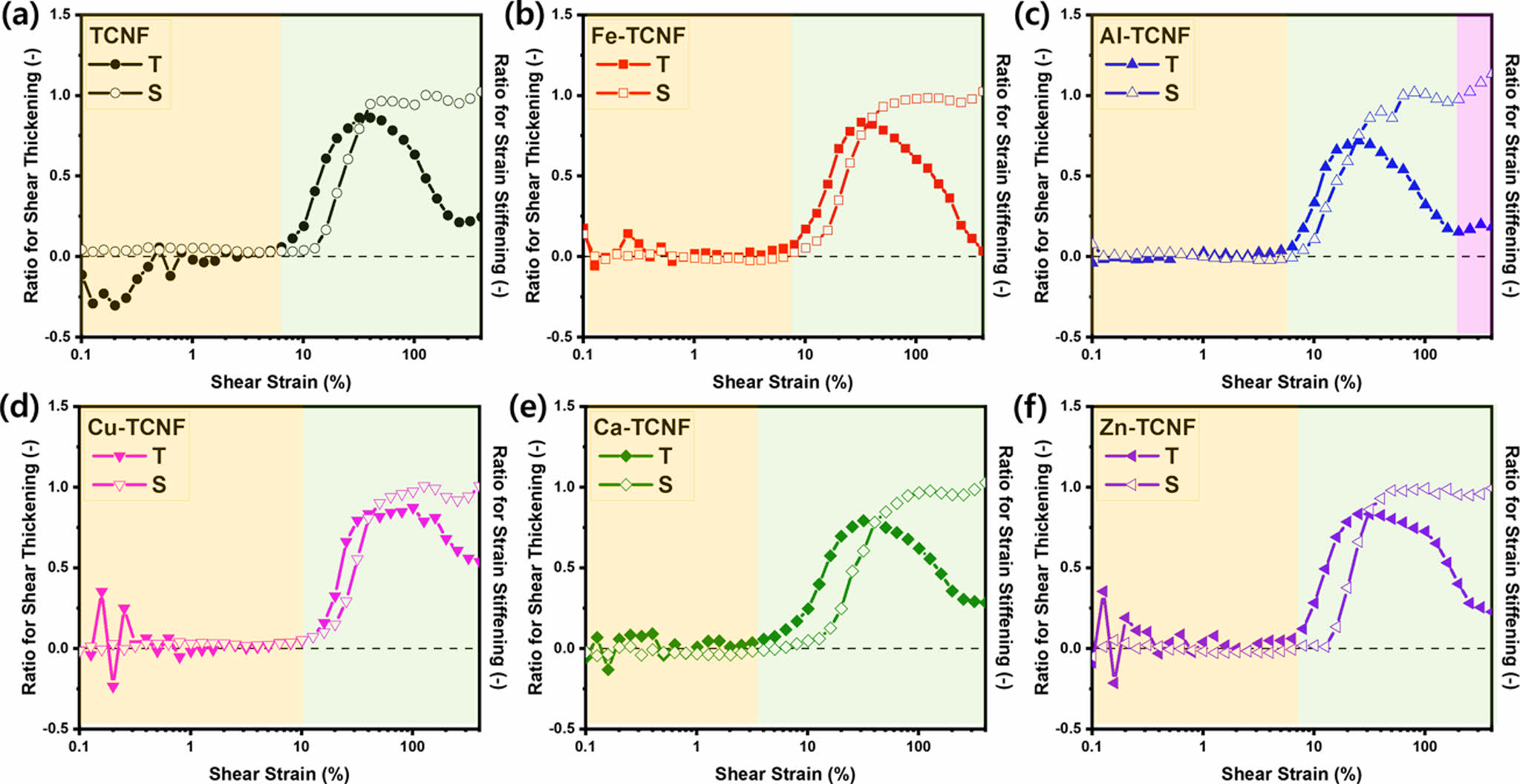 Fig. 4에서는 세포 배양 전 하이드로겔들의 S와 T 거동을 나타낸 것이고, Fig. 5에서는 세포 배양 후 하이드로겔들의 S와 T 거동을 나타낸 것이다. Fig. 2와 Fig. 3에서의 경향과 동일하게 세포 배양 전에는 금속염의 종류에 따라 거동이 다르지만, 세포 배양 후의 하이드로겔들의 거동은 모두 동일하다. 특히, 세포 배양 전 Fe-TCNF, Al-TCNF, 그리고 Cu-TCNF의 경우 T가 2번의 변곡점을 나타내지만, 세포 배양 후에는 모든 하이드로겔들이 단일 곡선과 유사한 S와 T 거동을 나타낸다. 이는 세포 배양 전 하이드로겔들이 더 복잡한 네트워크(network)를 가지고 있는 것을 의미하고, 금속염의 종류에 따라 금속-카르복실레이트 배위 결합이 구조적 무너짐 거동에 미치는 영향이 다르다는 것을 의미한다. 또한, 순수한 하이드로겔들의 경우 TCNF의 점성 거동이 우세하기 때문에 변형율이 증가할수록 전단 농화(shear thickening) 거동에서 전단 담화(shear thinning) 거동으로 변화하지만, 세포가 배양된 하이드로겔드르이 경우 세포의 탄성 특성이 더 우세하게 발현되어 T가 0보다 큰 전단 농화 거동만 나타내는 것을 확인할 수 있다.