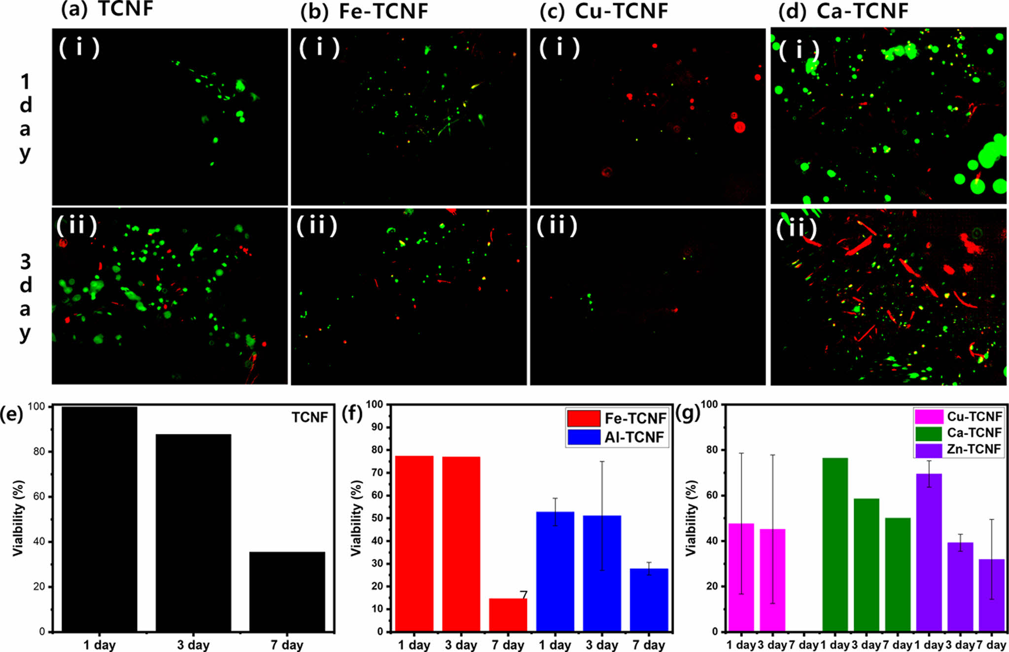 Fig. 6 (a-d) Live and dead assay images of HUVEC cells cultured on TCNF, Fe-TCNF, Cu-TCNF, and Ca-TCNF hydrogels after 1 day and 3 7 days cell culturing. (e-g) Cell viability of TCNF and M-TCNF with different metal cations |
