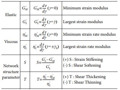 LAOS 측정을 통해 얻은 비선형 점탄성 매개변수들을 이용하여 응력(stress)과 변형(deformation)으로 곡선을 나타내는 Lissajous-Bowditch(LB) 곡선을 얻을 수 있다. LB 곡선을 통해 국부적 탄성 측정값(local elastic measures)과 국부적 점도 측정값(local viscosity measures)을 얻을 수 있고, 이를 이용하여 비선형 매개변수인 ‘strain-stiffening ratio (S)’와 ‘shear-thickening ratio (T)’를 얻을 수 있다. S와 T 매개변수를 얻기 위해 필요한 인자, 수식 및 경향성을 Table 1에 나타내었다.