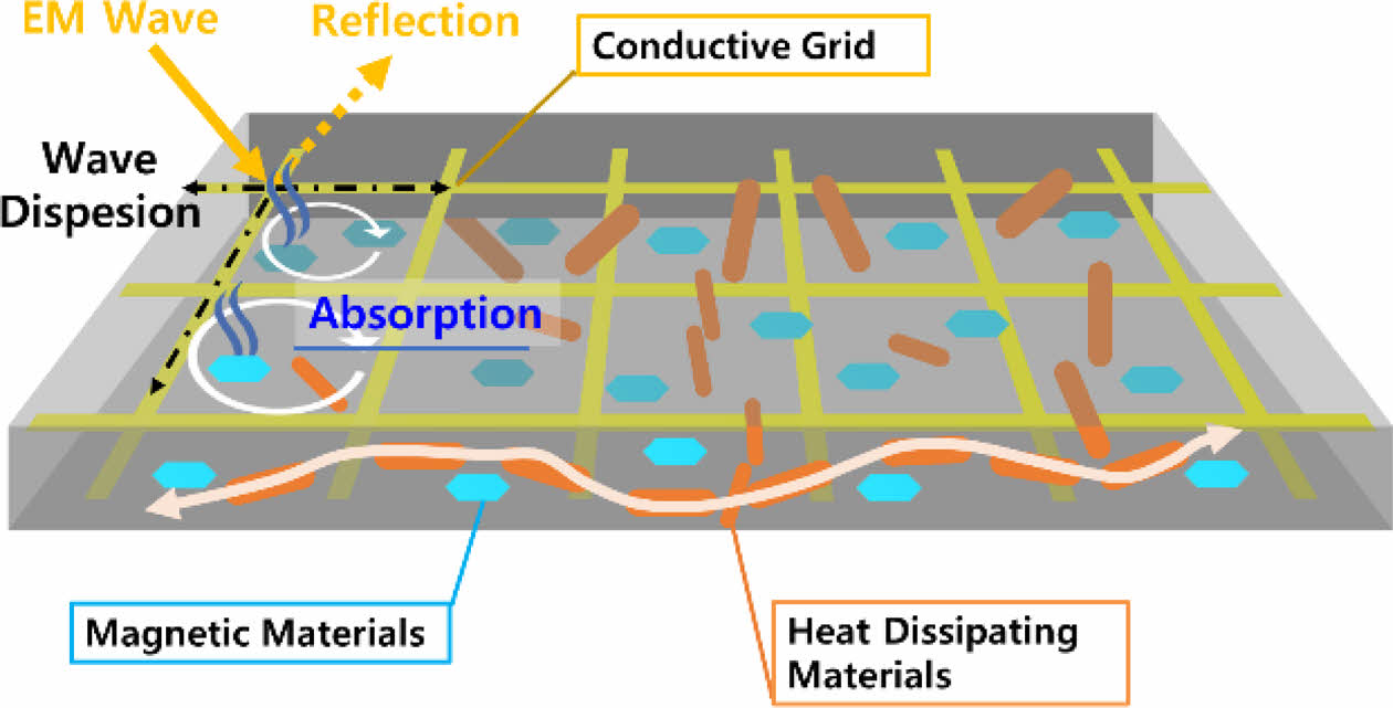 이 때 입사한 전자파는 자성소재가 발현하는 유전손실/자성손실에 의해 전자파 에너지가 열에너지로 변환되어 소실된다. 전도성 그리드는 이 때 크게 세 가지 역할을 수행하는데, (1) 입사한 전자파를 소재 전체 평면에 분산시킴으로써 필름에 분산된 자성소재의 흡수 기여를 활발하게 하고 (2) 그리드 자체의 전도손실을 활용하여 입사한 전자파를 추가로 흡수하며 (3) 적절한 임피던스를 가져 전체 필름의 임피던스와 공기 임피던스의 차이를 저감시킨다.