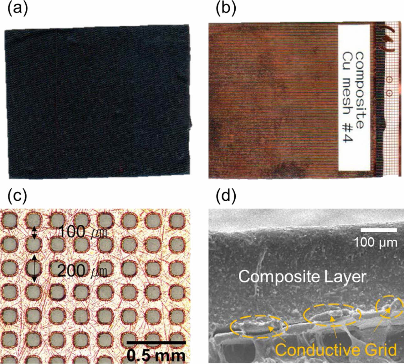 Fig. 2 Morphology of the proposed composite shielding film: (a) Front view of the composite film; (b) Rear view of the composite film; (c) Optical microscopic image of the conductive grid; (d) SEM image of the composite film cross section |