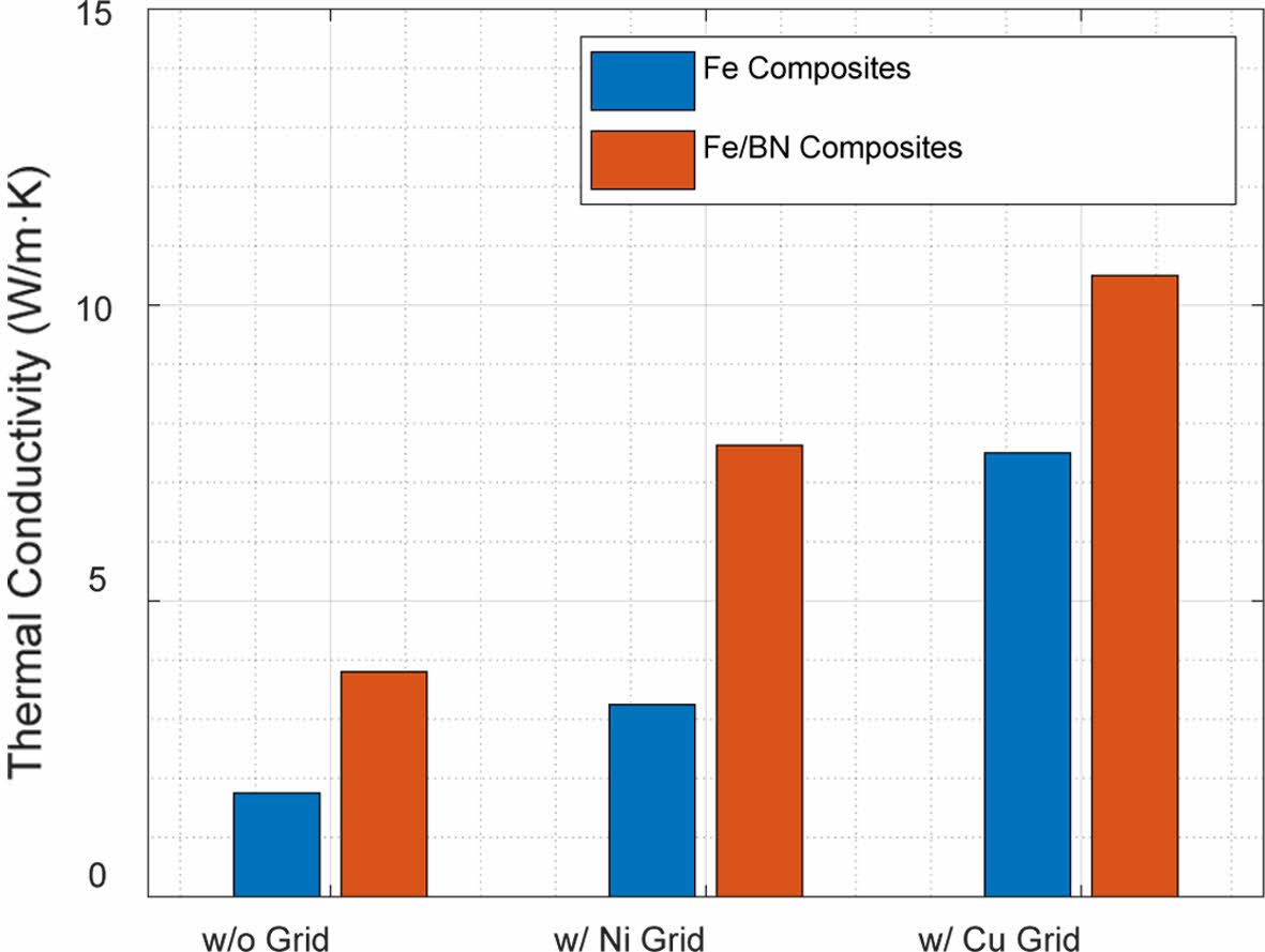 복합소재 레이어에 포함되어 있는 방열소재는 레이어 내부에서 열전도 네트워크를 형성하여 열에너지의 빠른 확산에 기여한다. 이 때 적은 양의 방열소재로 우수한 열전도도를 얻기 위해서는 방열소재의 네트워크 구성이 요구되며, 퍼콜레이션 구조의 형성 등을 통해 우수한 열전도도를 확보할 수 있음이 알려져 있다[23]. 그러나 본 연구에서는 전자파 흡수차폐 특성의 확보를 위해 별도의 내부구조 제어가 이루어지지 않았다. 전도성 그리드 또한 열전도도 향상에 기여하는데, 그리드를 구성하는 금속이 일반적으로 높은 열전도도를 가지는 만큼 그리드가 형성되어 있는 방향으로의 열확산이 용이하게 이뤄질 수 있도록 한다.