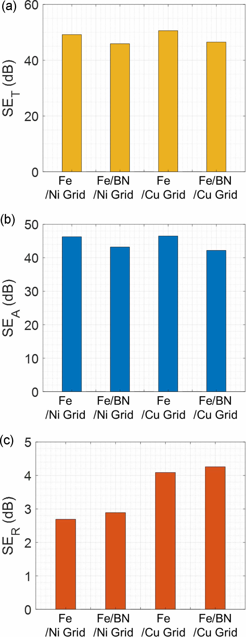 그리드와 복합화된 4종의 시편에 대해 전자파 차폐능을 측정한 결과는 Fig. 4와 같다. 전자파 차폐능은 입사한 전자파 중 얼마나 많은 전자파가 소재를 투과하였는지를 나타내는 지표로, 높은 차폐능을 가질수록 적은 전자파가 투과함을 의미한다. 차폐능은 반사능과 흡수능으로 분리하여 설명할 수 있는데, 각각은 입사한 전자파 중 얼마나 많은 전자파가 반사되었는지를 나타내는 지표, 반사되지 않은 전자파 중 얼마나 많은 전자파가 흡수되었는지를 나타내는 지표이다. 따라서 전체 차폐능은 반사능과 흡수능의 합과 같다. 일반적으로 20 dB 이상의 차폐능을 갖고 있는 경우 99%의 전자파를 차폐해 시스템 적용이 가능하다고 평가받으며, 40 dB 이상의 차폐능을 갖고 있는 경우 99.99%의 전자파를 차폐해 매우 우수하다고 평가된다.