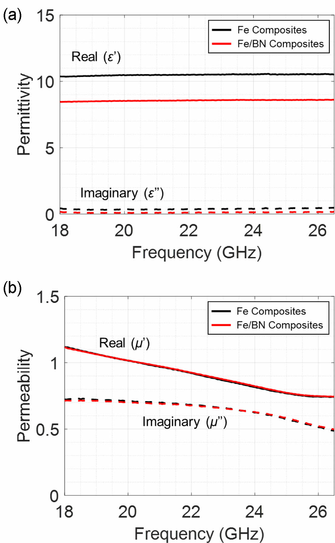 복합소재 레이어의 전자기 특성(유전율 및 투자율)은 복합소재 레이어를 10.7 × 4.3 mm2으로 가공 후 도파관에 삽입하여 측정한 S-parameter로부터 Nicholson-Ross-Weir 방법을 이용해 계산하였다[24].