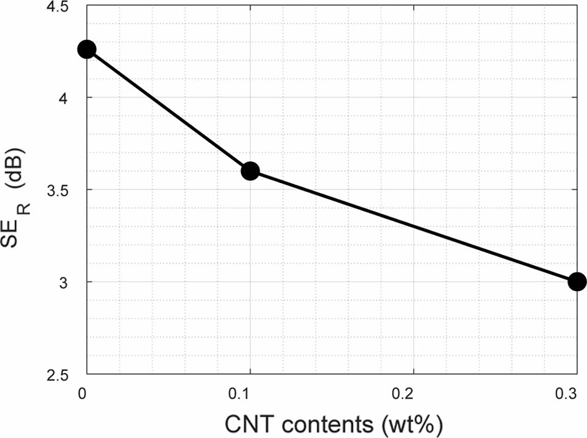 따라서 Cu 그리드를 사용하는 경우 높은 열전도도를 얻을 수 있으나, 반사능 또한 높아지게 되기에 우수한 흡수차폐 필름이라 할 수 없다. 따라서 높은 열전도도와 낮은 반사능을 동시에 확보하기 위해 유전율 제어가 필요하며, 이를 위해 Fe/BN 복합소재 레이어를 제조하는 과정에서 MWCNT를 추가 투입하여 흡수차폐/방열 복합소재 필름을 제조하였다. 이 때 CNT 함량 증가에 따라 반사능이 감소하여 0.3 wt% 투입시 반사능이 3 dB에 도달하는 것을 확인하였다(Fig. 6). 이는 BN분말 투입과는 반대로 CNT의 투입에 의해 유전율이 상승하기 때문에 공기와의 임피던스 차이 저감에 긍정적인 영향을 주기 때문이라고 판단된다.