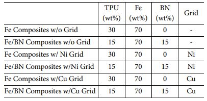 TPU 수지와 철계 분말, BN 분말을 적절한 비율로 혼합한 후 5분간 플래네터리 믹서(ARE-310, Thinky)에서 2000 rpm으로 분산하여 복합소재 레이어로 활용될 페이스트를 제조한다. 제조된 페이스트를 블레이드 캐스팅을 통해 100 mm 두께의 필름으로 제조한다. 제조된 필름은 110°C에서 4시간 동안 건조해 DMF 용매와 불필요한 기포를 제거한다. 건조가 종료된 후, 필름 5장을 차례로 적층하고 그 위에 금속 그리드를 최종 적층한 후 120°C에서 20분간 10 MPa의 압력을 가하는 핫 프레스 공정을 통해 400 μm 두께의 흡수차폐/방열 복합소재 필름을 제조한다. 실험에 사용된 TPU 수지와 철계 분말, BN 분말의 비율 등의 조건은 Table 1과 같다.