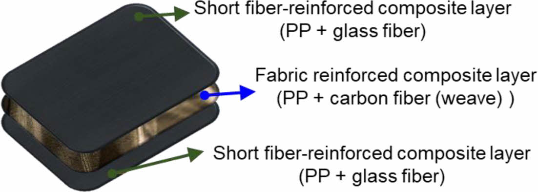 배터리 하우징의 복합재 구성은 세 개의 층으로 나뉘며 총 두께는 3 mm이다. 복합재 각 층의 두께는 난연층의 경우 0.5 mm이며 직물층은 2 mm이다. 난연층 재료는 SABIC사의 PPcompound H1020로, 압축 성형 시뮬레이션에 고려된 재료의 물성은 제조사측에서 진행한 실험을 통해 측정된 값을 사용하였다. 측정된 재료의 물성은 유변학적 성질, 열 속성, 기계적 성질 등을 포함한다. 난연층의 압축 성형 공정 해석을 위해 상용 소프트웨어인 Moldflow를 이용했으며 압축 성형 후 섬유 배향 및 잔류응력 값을 획득했다.