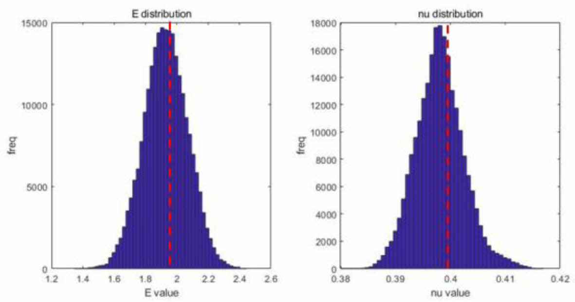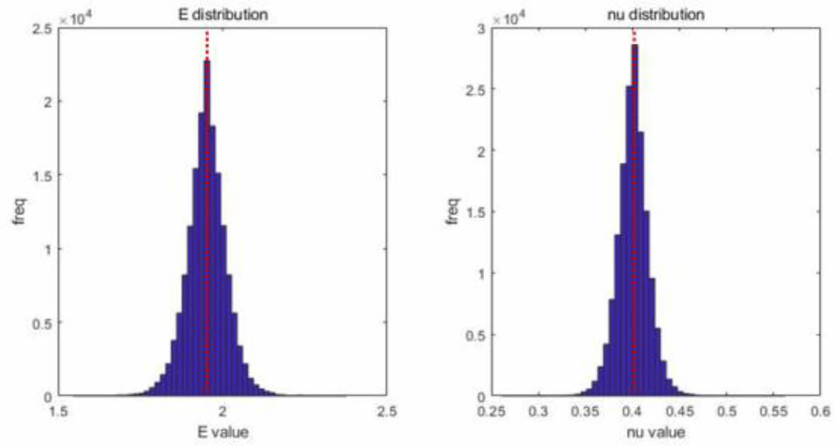 KLE 기법으로 구해진 기지의 랜덤 물성은 기지의 요소와 적분점에 따른 다르게 저장된다. KLE기법을 활용하여 두 종류의 복합재 층의 미소 구조물의 기지 영역에 대한 물성 분포를 획득했다. 자세한 기지 물성 분포는 Fig. 3와 Fig. 4에 나타냈다. 특히, 빨간색 점선으로 KLE 랜덤 변수의 평균값을 표기했으며 히스토그램을 통해 정규 분포의 형태로 기지 물성이 반영됐음을 확인했다. 각 평균값은 Table 3과 Table 4에 명시됐다. 상관 길이에 따라 기지 물성 분포 정도가 달라지는 것을 확인했다. 상대적으로 큰 상관 길이를 이용한 직물층의 기지 물성 분포가 난연층의 기지 물성 분포보다 크다는 것을 확인했다.