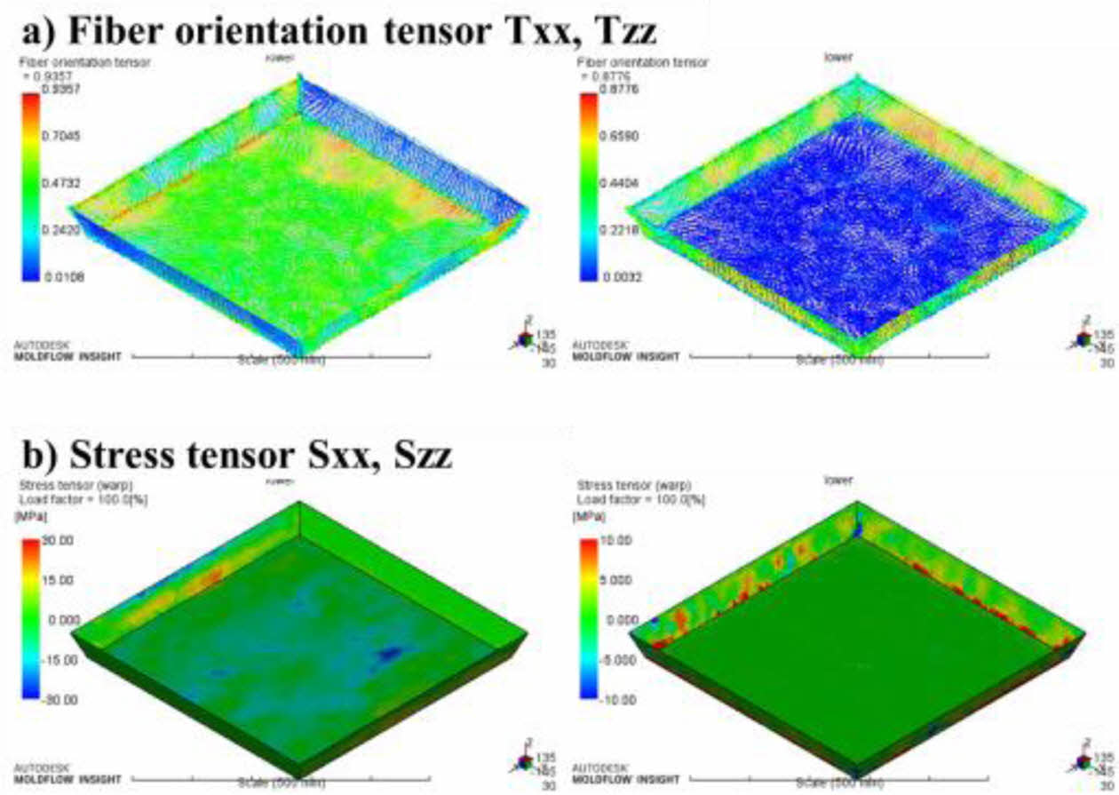 Moldflow 3D 변형해석을 통해 압축 성형 이후 냉각된 복합재에 발생하는 잔류응력을 예측했다. 압축 성형 해석에서 획득한 섬유 배향과 잔류응력을 배터리 하우징 모델에 contour 형태로 Fig. 5에 정리했다. Fig. 5a)의 경우 섬유 배향 값이며 Fig. 5b)의 경우 잔류응력 값이다.