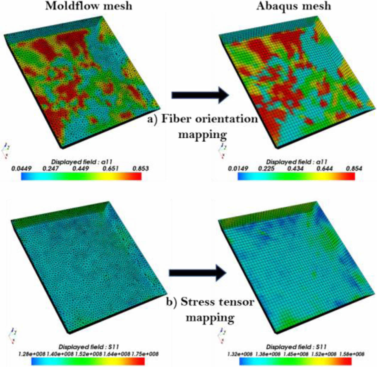 성형해석 결과인 잔류응력을 구조해석 초기 조건으로 성립하여 실제 공정을 고려한 구조해석을 진행할 수 있다. 예측된 섬유 배향과 잔류응력 결과는 Digimat-MAP을 통해 Moldflow 메쉬에서 ABAQUS 메쉬로 맵핑하여 성형 해석 결과 데이터를 구조 해석과 연계할 수 있도록 했다. 자세한 맵핑 결과를 Fig. 6에 나타내었다. Fig. 6a)의 경우 섬유 배향 값의 맵핑 결과이며 Fig. 6b)의 경우 잔류응력 값의 맵핑 결과이다.