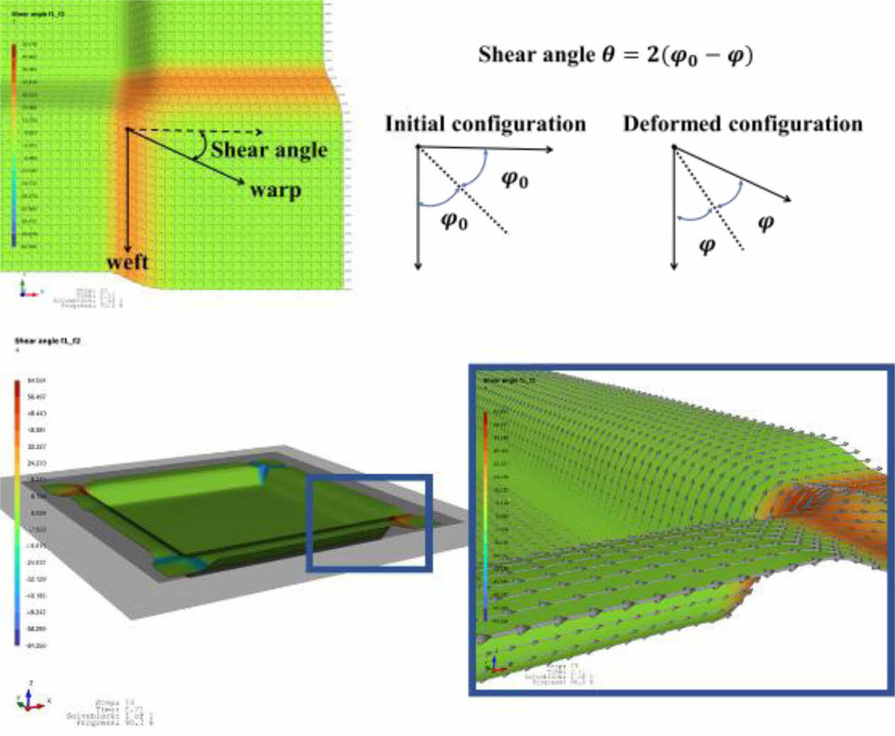 Fig. 7는 Aniform의 드레이핑 시뮬레이션을 통해 예측한 전단 각도 및 평직의 경사 방향의 섬유 배향을 보여주고 있다.