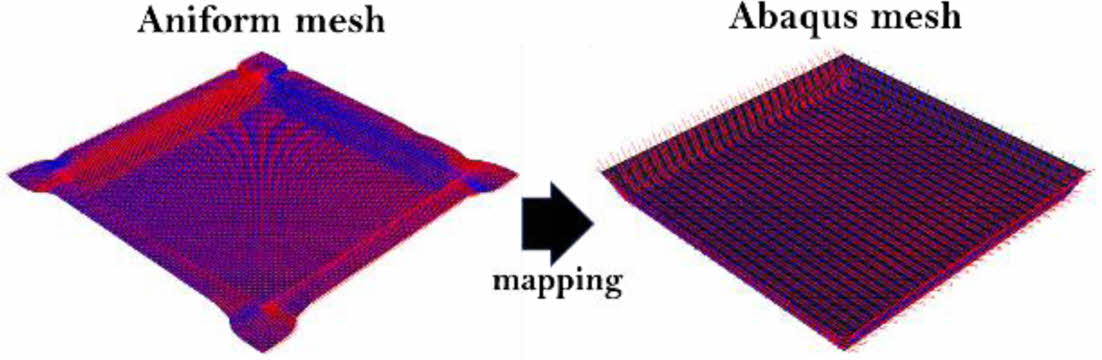 성형 공정 해석을 연계한 구조 해석을 하기 위해 Aniform의 드레이핑 해석 결과인 직물 배향 정보를 유한요소에 매핑했다. 자세한 매핑 결과를 Fig. 8에 나타냈다.