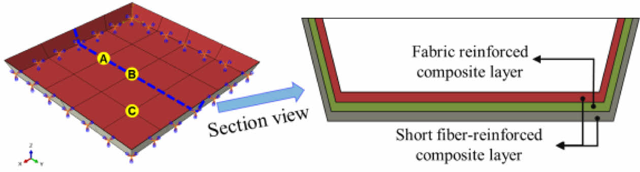 배터리 하우징 하단부에 포함된 복합재 층을 반영하기 위해 Fig. 9와 같이 유한요소 모델링을 진행했다. Fig. 9 좌측은 배터리 하우징 하단부를 단순화한 유한요소 모델이며 원활한 후처리를 위해 세 개의 노란색 지점을 선정했다. Fig. 9 우측은 유한요소 모델에 반영된 각 복합재 층을 단순화하여 표현한 것이다. 모든 복합재 층 사이에 타이 구속조건을 적용했다. 직물 강화 복합재료 층에 이용한 요소 타입은 삼각형 쉘 요소(S3)이고 불연속 섬유 강화 복합재료 층에는 3차원 10절점 테트라 요소(C3D10)를 이용했다.