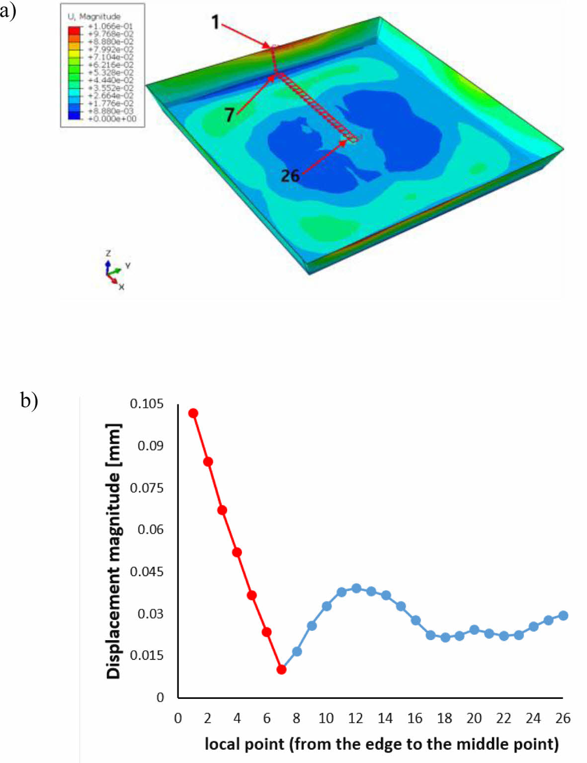 Fig. 10 Effects of the residual stress; a) deformation contour and b) displacement magnitude along the prescribed red line |